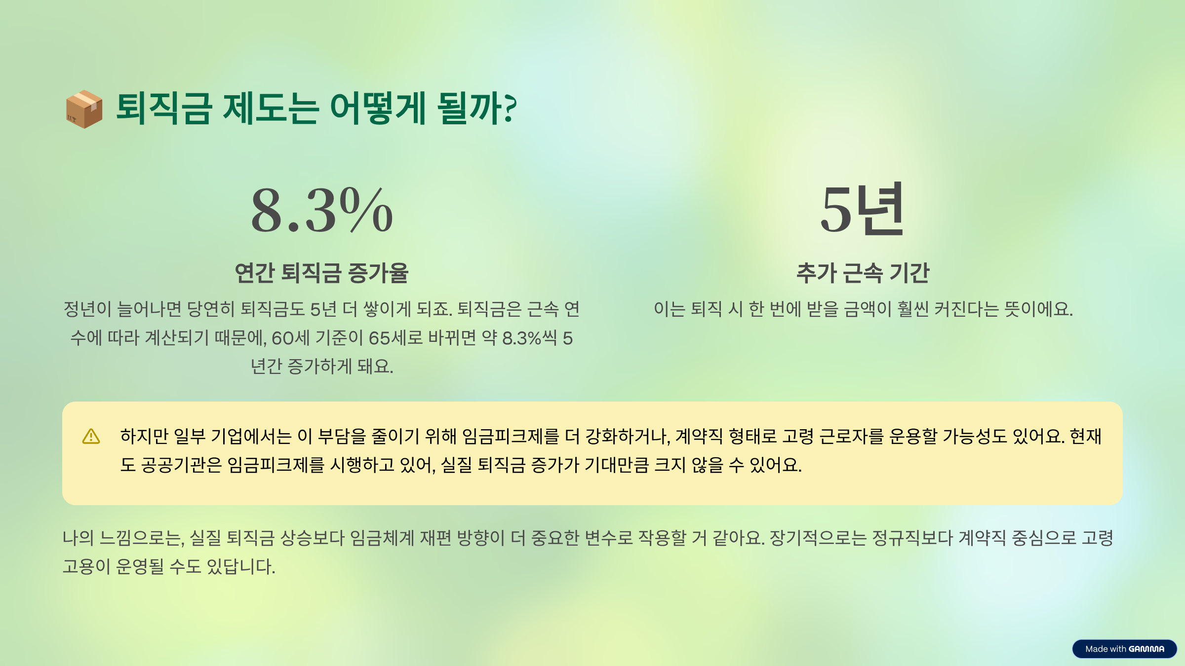나의 느낌으로는, 실질 퇴직금 상승보다 임금체계 재편 방향이 더 중요한 변수로 작용할 거 같아요. 장기적으로는 정규직보다 계약직 중심으로 고령 고용이 운영될 수도 있답니다.