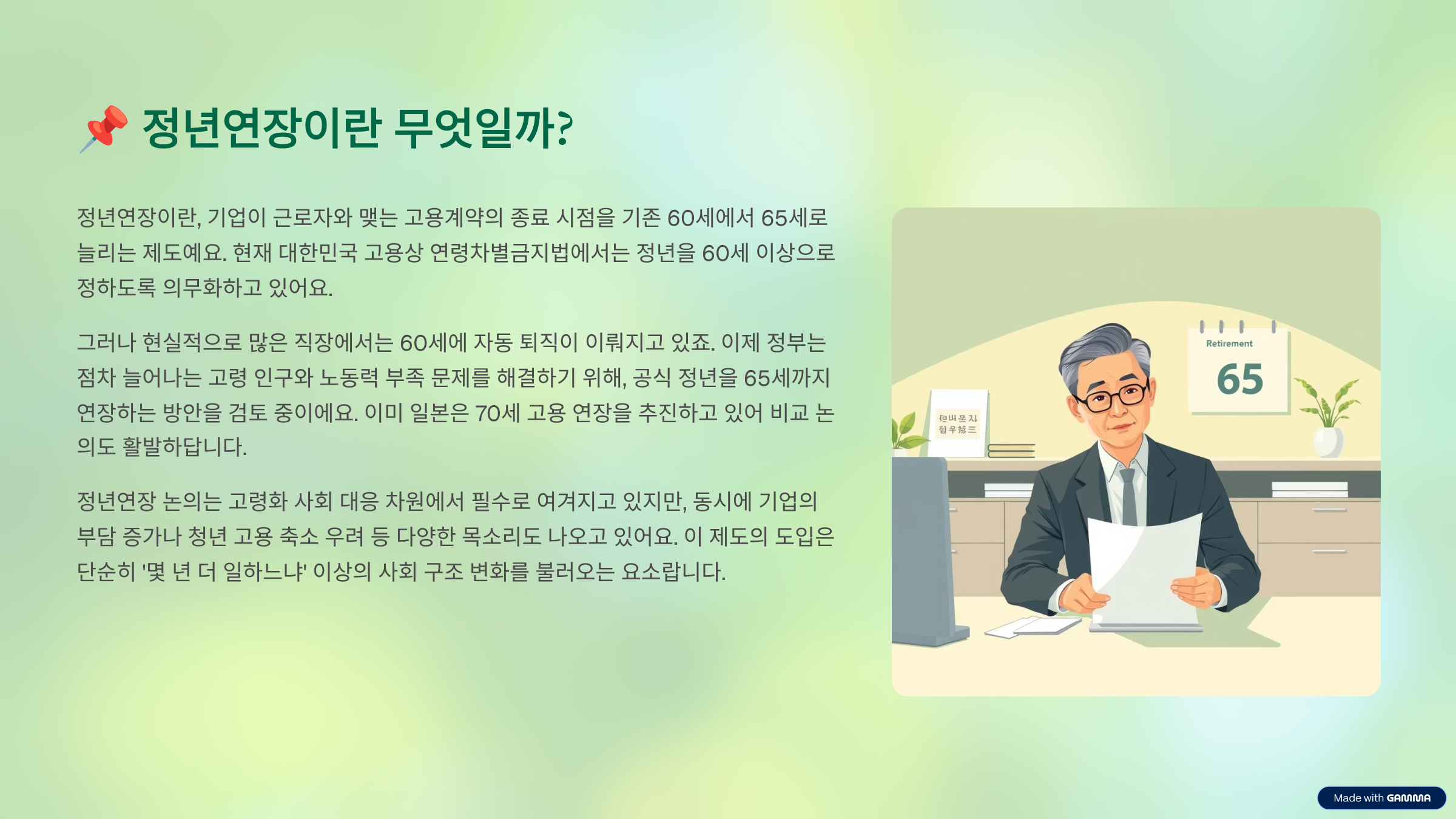 정년연장이란, 기업이 근로자와 맺는 고용계약의 종료 시점을 기존 60세에서 65세로 늘리는 제도예요. 현재 대한민국 고용상 연령차별금지법에서는 정년을 60세 이상으로 정하도록 의무화하고 있어요.