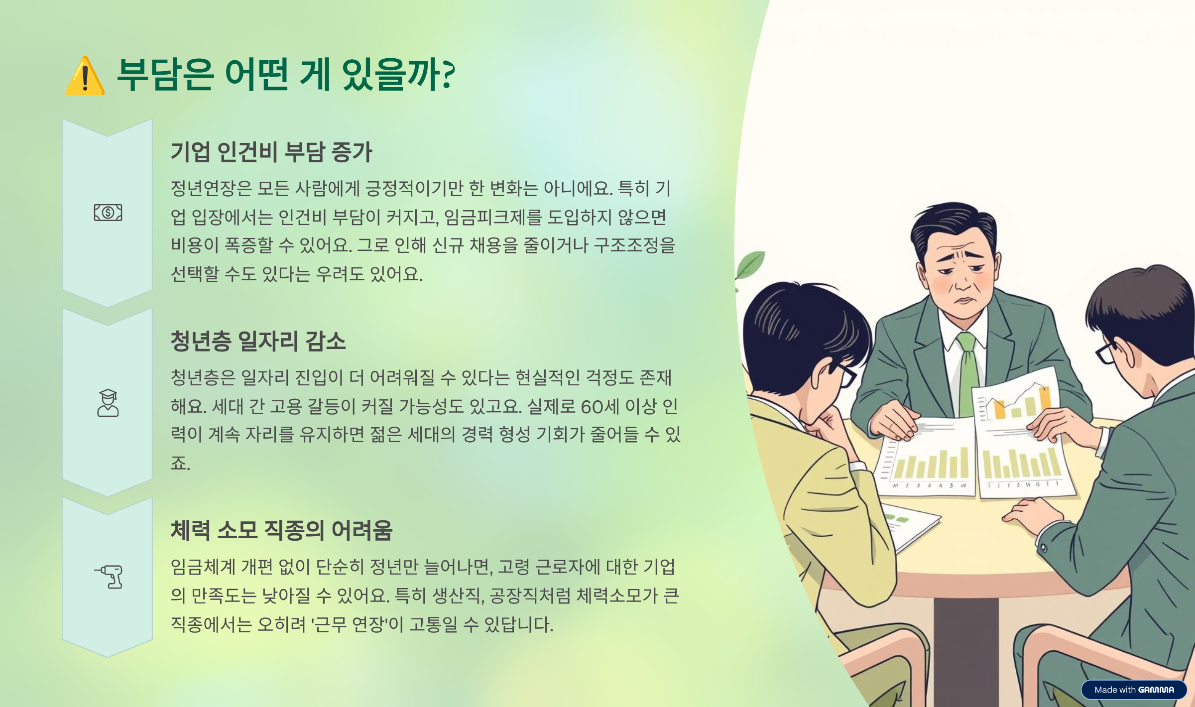 정년연장은 모든 사람에게 긍정적이기만 한 변화는 아니에요. 특히 기업 입장에서는 인건비 부담이 커지고, 임금피크제를 도입하지 않으면 비용이 폭증할 수 있어요. 그로 인해 신규 채용을 줄이거나 구조조정을 선택할 수도 있다는 우려도 있어요.