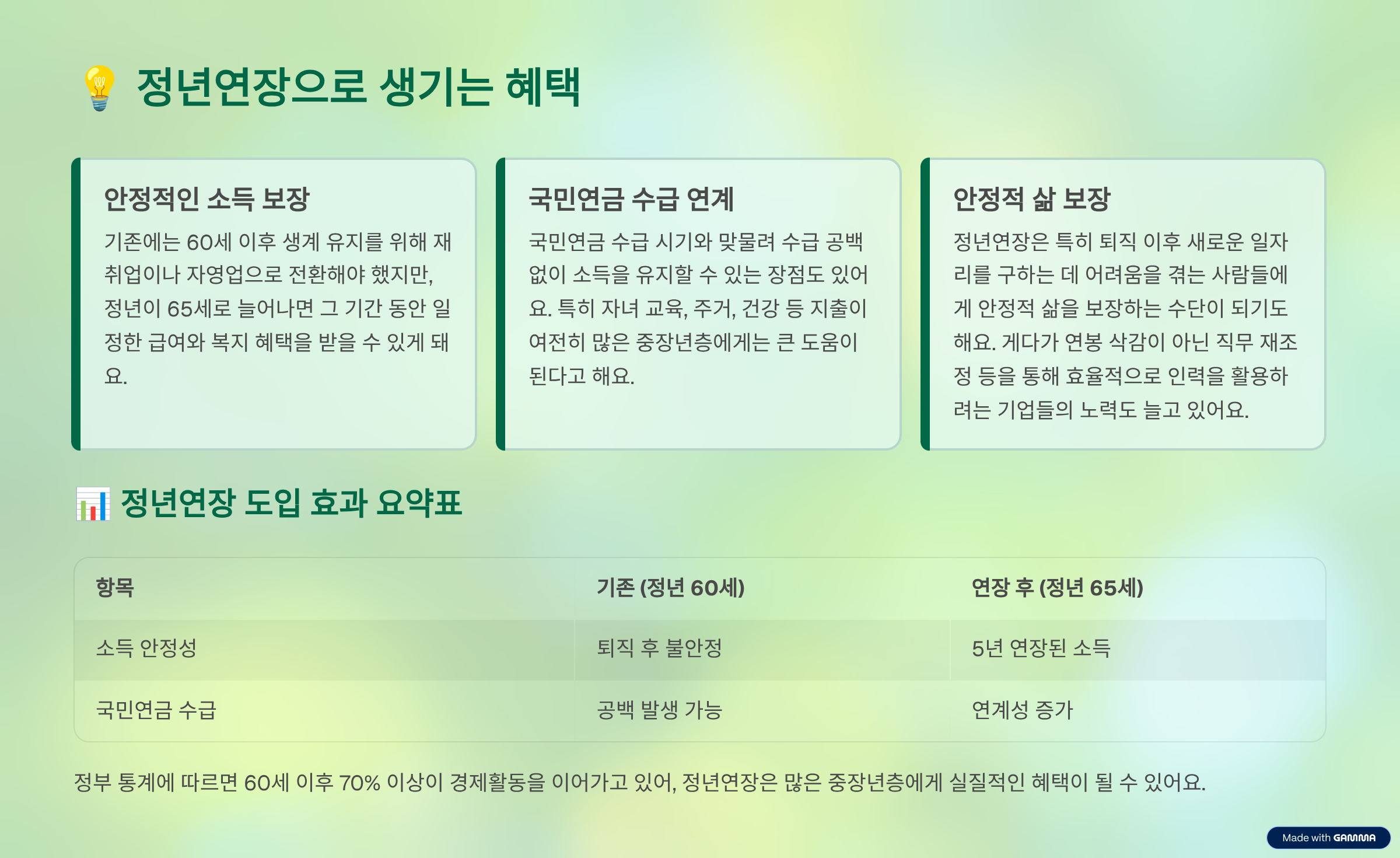 | 소득 안정성 | 퇴직 후 불안정 | 5년 연장된 소득 |