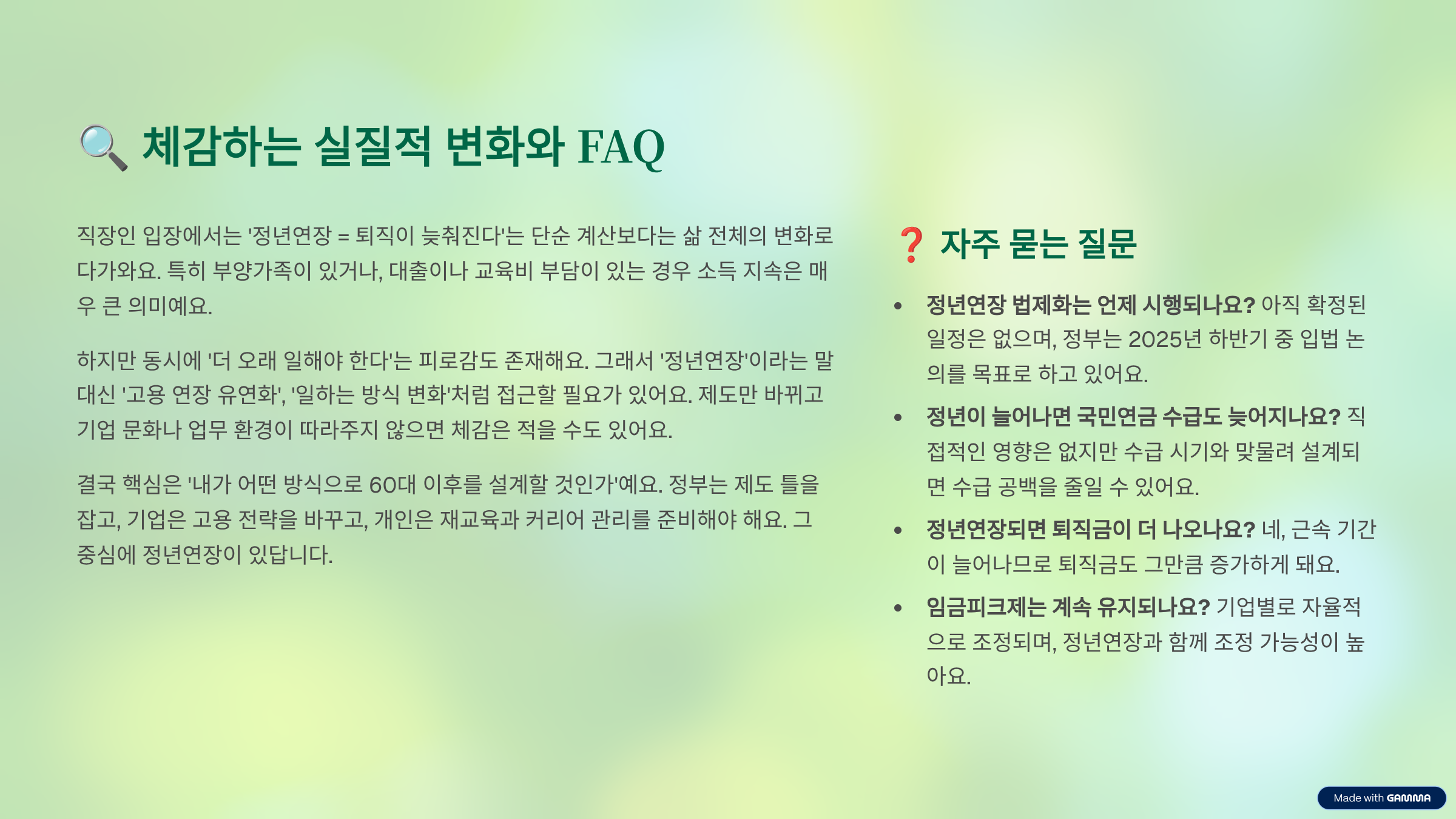 하지만 동시에 '더 오래 일해야 한다'는 피로감도 존재해요. 그래서 '정년연장'이라는 말 대신 '고용 연장 유연화', '일하는 방식 변화'처럼 접근할 필요가 있어요. 제도만 바뀌고 기업 문화나 업무 환경이 따라주지 않으면 체감은 적을 수도 있어요.