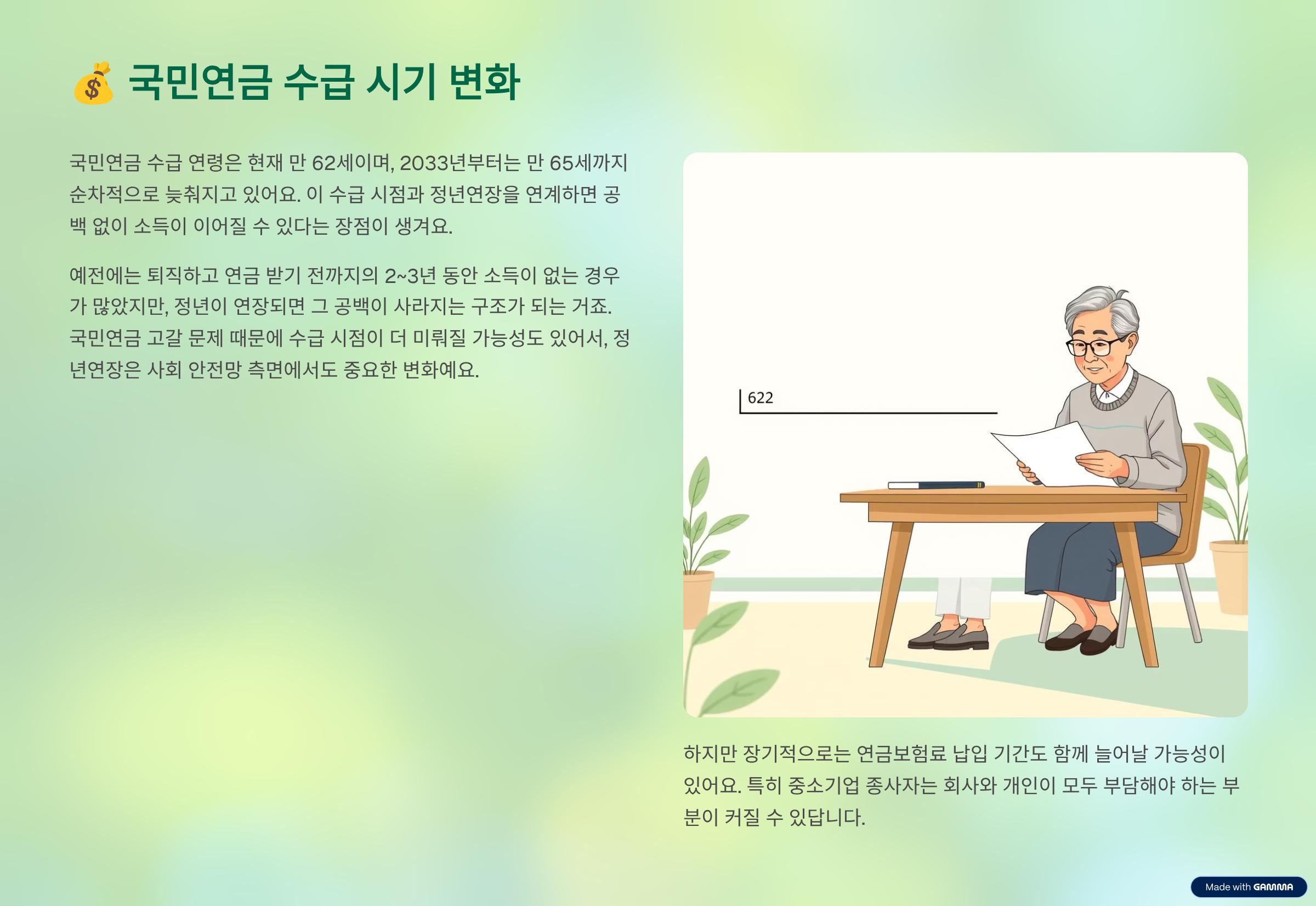 하지만 장기적으로는 연금보험료 납입 기간도 함께 늘어날 가능성이 있어요. 특히 중소기업 종사자는 회사와 개인이 모두 부담해야 하는 부분이 커질 수 있답니다.