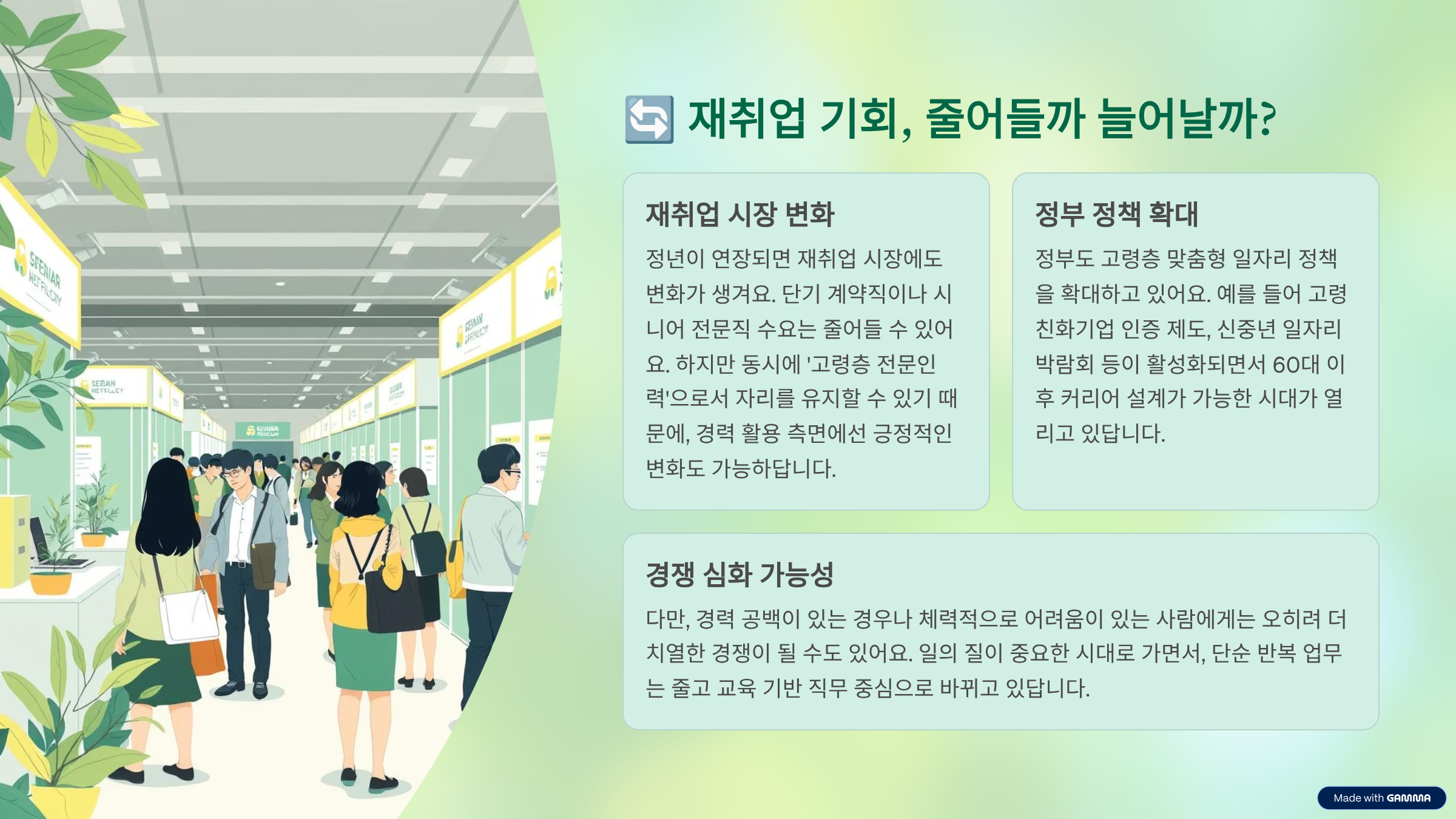 정년이 연장되면 재취업 시장에도 변화가 생겨요. 단기 계약직이나 시니어 전문직 수요는 줄어들 수 있어요. 하지만 동시에 '고령층 전문인력'으로서 자리를 유지할 수 있기 때문에, 경력 활용 측면에선 긍정적인 변화도 가능하답니다.