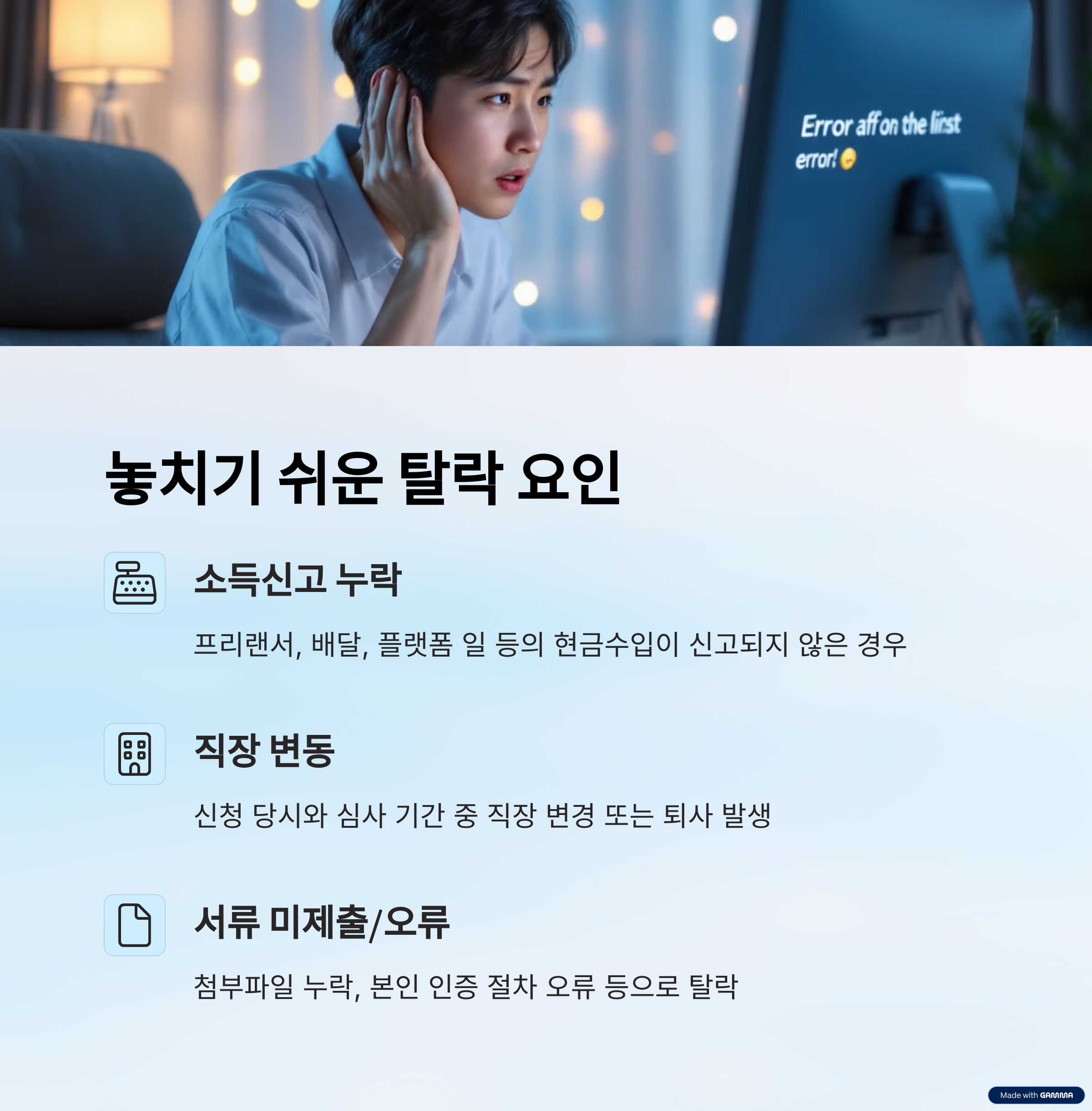 세 번째는 ‘서류 미제출 또는 오류’예요. 온라인으로 신청하면서 누락된 첨부파일이나, 본인 인증 절차 중 오류가 발생하면 시스템에서는 ‘조건 미충족’으로 처리돼요. 별거 아닌 실수 하나로 탈락하는 셈이죠.
