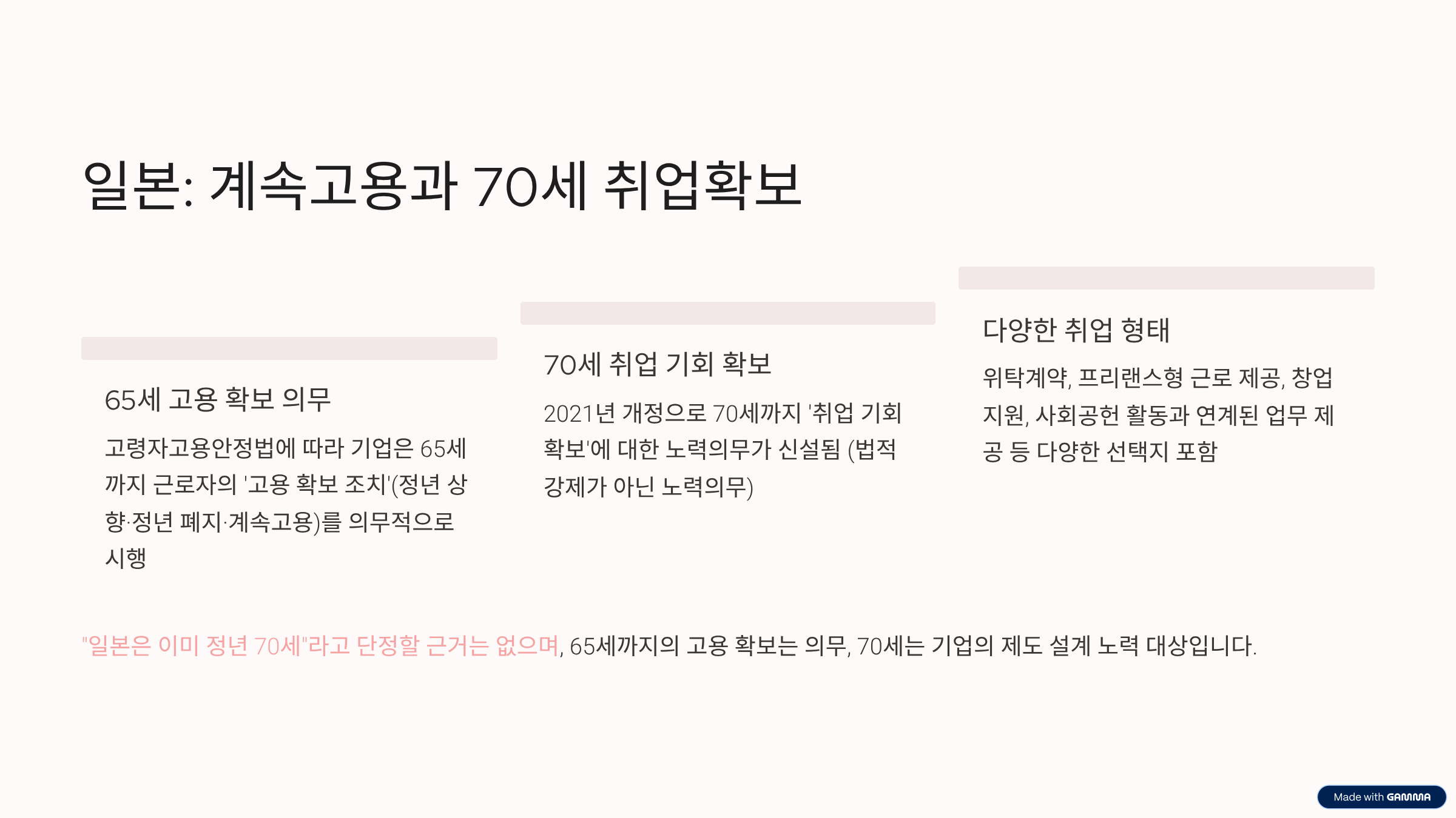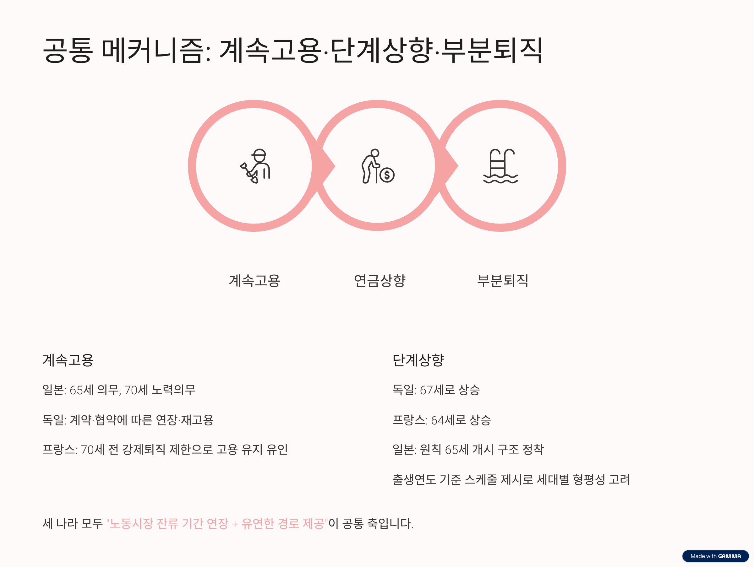 계속고용: 일본은 65세 의무, 70세 노력의무. 독일은 계약·협약에 따른 연장·재고용. 프랑스는 70세 전 강제퇴직 제한으로 결과적으로 고용 유지 유인이 커요.