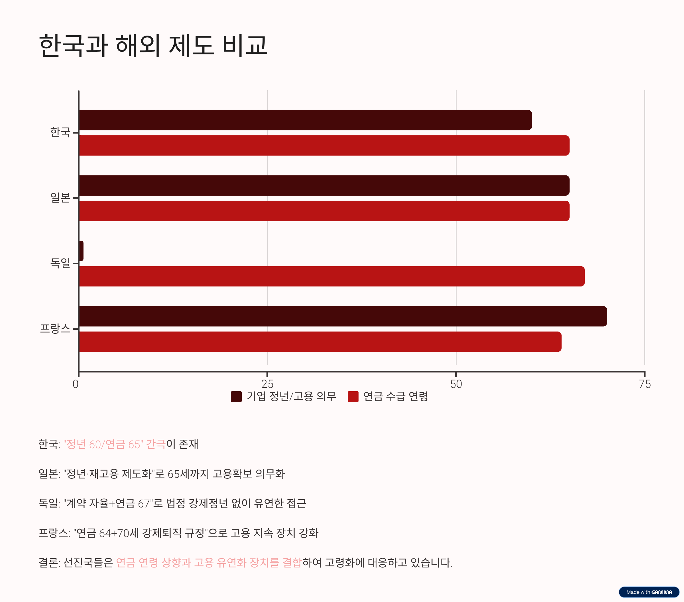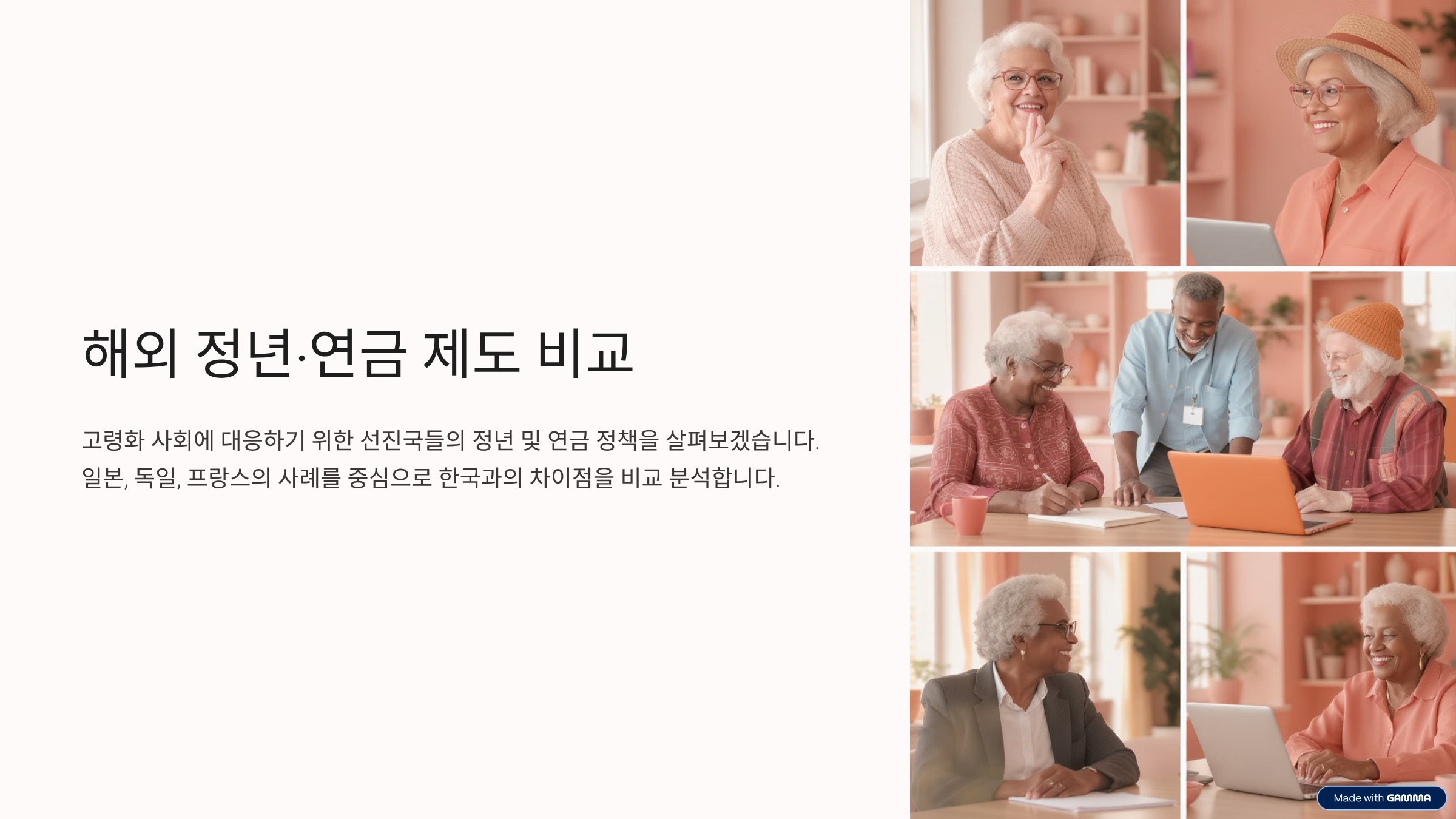 요약: 한국은 “정년 60/연금 65” 간극, 일본은 “정년·재고용 제도화”, 독일은 “계약 자율+연금 67”, 프랑스는 “연금 64+70세 강제퇴직 규정”.