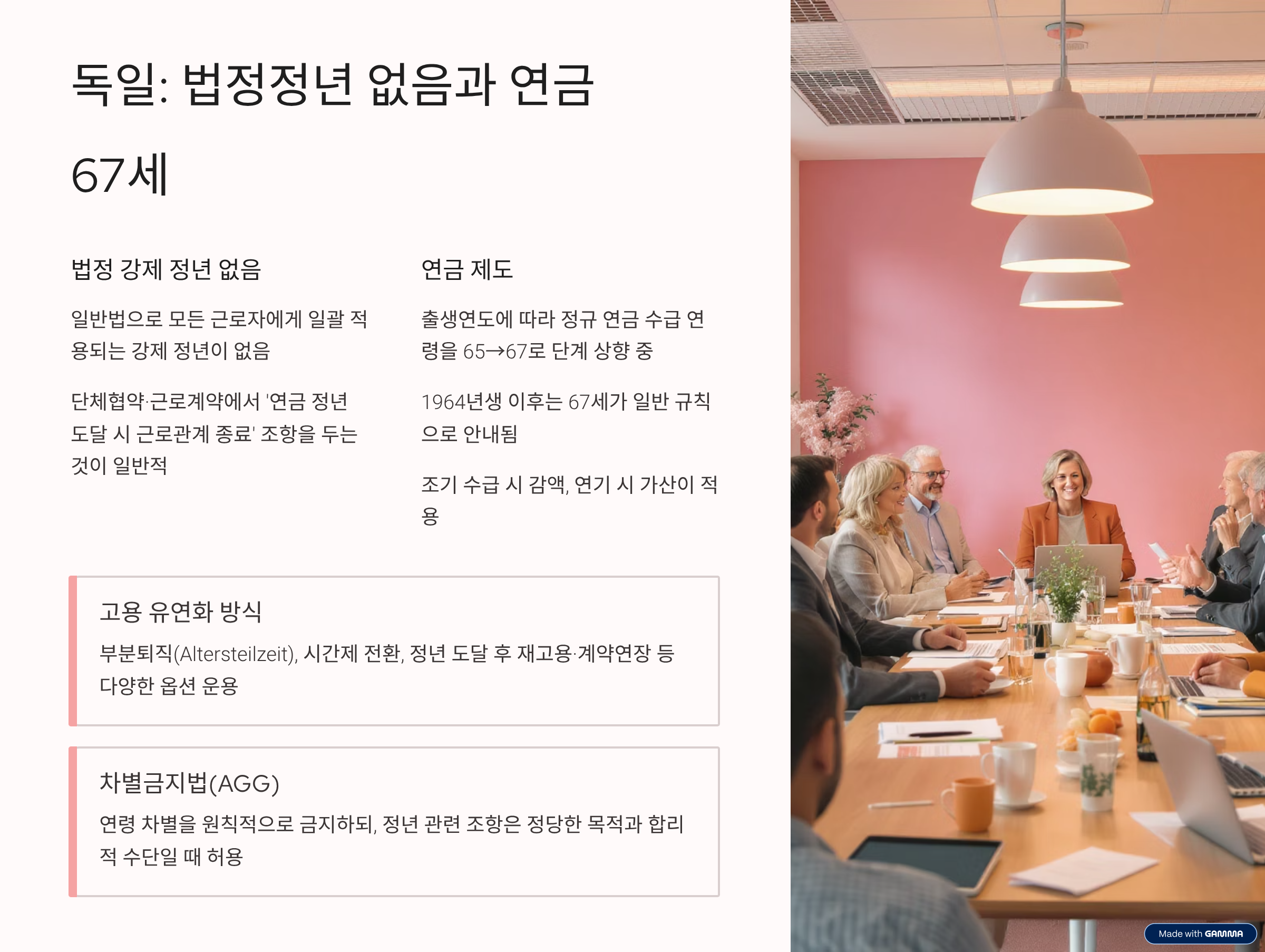 고용 유연화: 부분퇴직(Altersteilzeit), 시간제 전환, 정년 도달 후 재고용·계약연장 등 다양한 옵션이 운용돼요. 차별금지법(AGG)은 연령 차별을 원칙적으로 금지하되, 정년 관련 조항은 정당한 목적과 합리적 수단일 때 허용돼요.