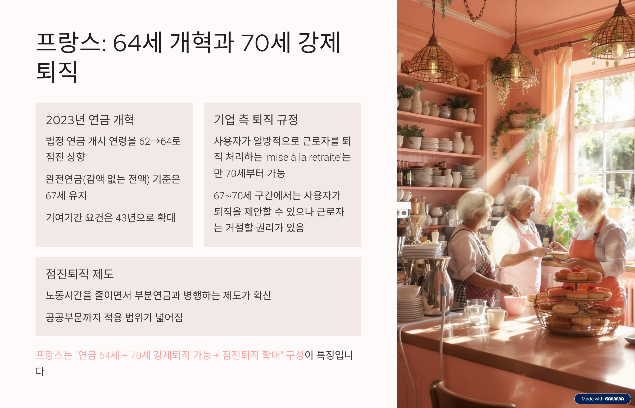 프랑스는 2023년 개혁으로 법정 연금 개시연령을 64세로 올렸고, 사용자 주도의 ‘강제퇴직’은 70세부터 가능해요. 67세 이후에는 사용자의 제안에 근로자가 거절권을 행사할 수 있다는 제도적 안전판이 있어요.