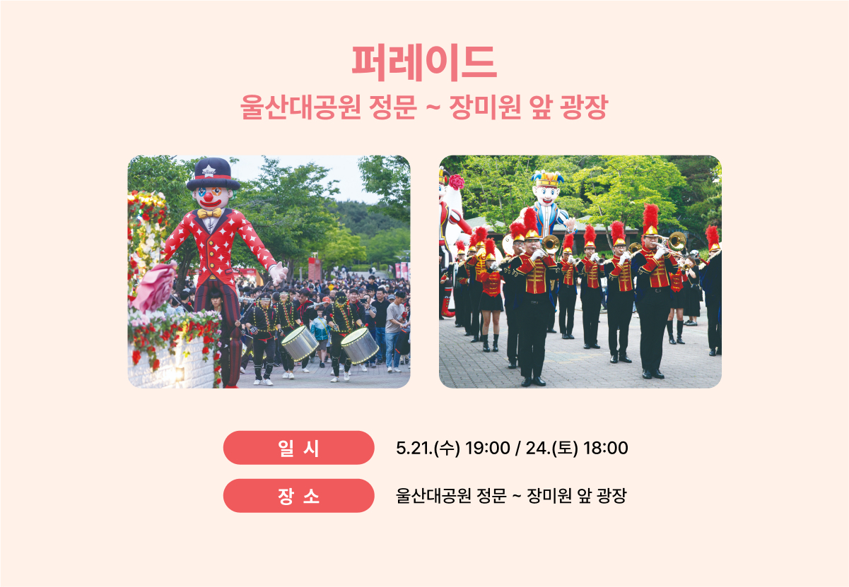 낮에도 밤에도 즐길 거리 가득한 울산 장미축제! 일정 잘 체크해서 하루를 꽉 채워보세요. 🕰️